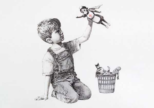 Το νέο έργο του Banksy παρουσιάζει ένα αγόρι να παίζει με τον αγαπημένο του σούπερ ήρωα, που δεν είναι άλλος από μία νοσηλεύτρια, ενώ δίπλα στο καλάθι των αχρήστων είναι ο Μπάτμαν και ο Σπάιντερμαν.