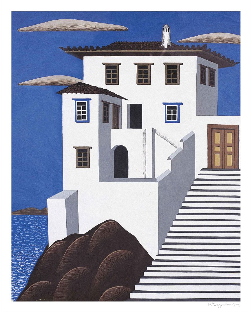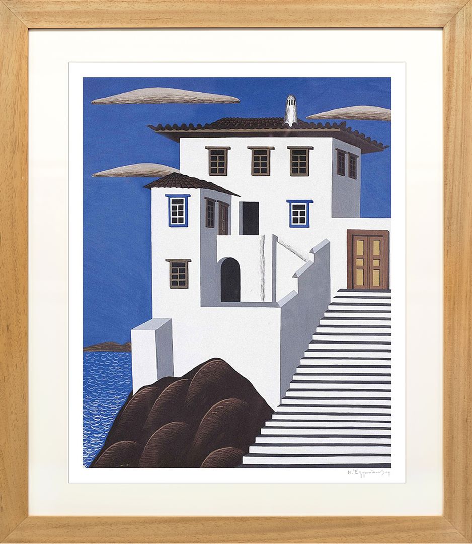 Νησιώτικο σπίτι, 1948 ψηφιακή υπογραφή με την έγκριση της κόρης και κληρονόμου των πνευματικών δικαιωμάτων του Νίκου Εγγονόπουλου, Ερριέττης Εγγονοπούλου (στην τιμή δε συμπεριλαμβάνεται η κορνίζα)
