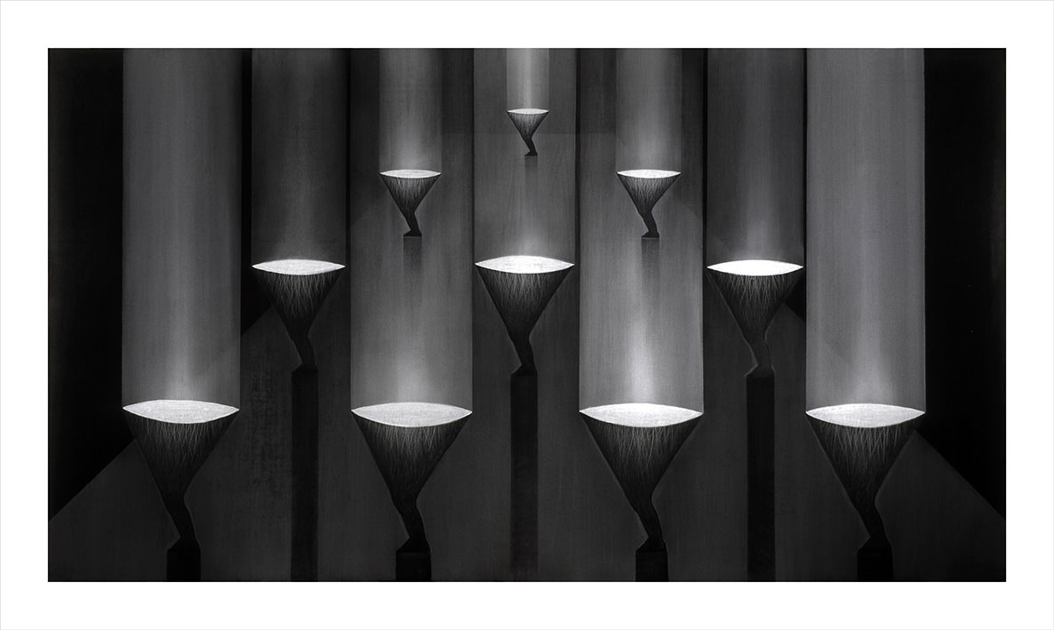 Περιγραφή: Το έργο διαπραγματεύεται το φως, όπου όμοια στοιχεία σε προοπτική διάταξη δημιουργούν μια ζωγραφική σύνθεση με έντονη τη μεταφυσική ατμόσφαιρα.
