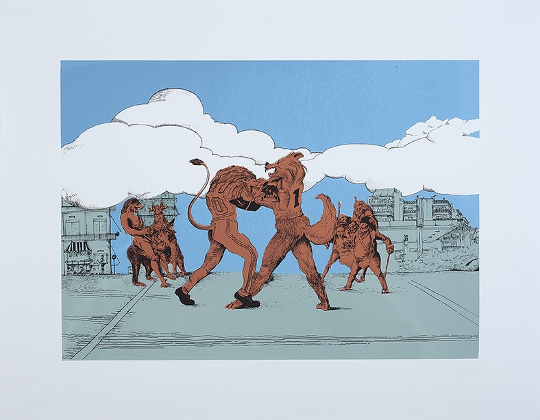 Περιγραφή: Το “Wolves VS Lions”, είναι μέρος σειράς έργων που σχολιάζουν την ανθρώπινη ανταγωνιστική φύση. Ανθρωπόμορφα ζώα παλεύουν μεταξύ τους για την επικράτηση και φιγούρες από χαρακτικά του Goya συνυπάρχουν σε ένα σημερινό αστικό τοπίο.