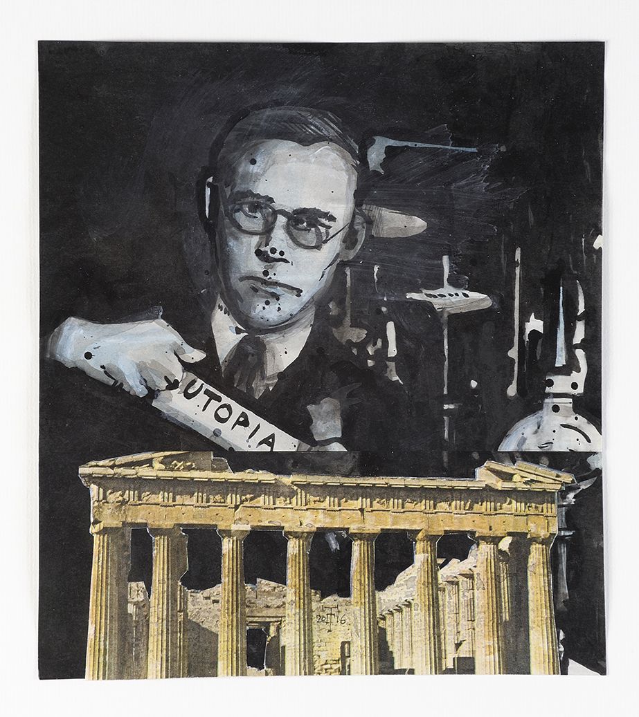 Collage, ink and acrylic on paper framed